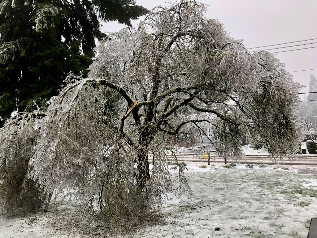 Last month we had the pleasure of residing in the border between a heavy rainstorm and a snowstorm. A thick coating of ice covered everything and we lost power. Through the night and the next morning, the house got colder and we put on more clothes. In the afternoon there was a lull and it seemed the roads would be as clear as they were going to get, so we drove to Andrea’s brother’s house, five miles away. He had no power either, but he has a wood-burning stove to heat the house and a gas range to cook on. We stayed with him for four days until power was restored. We enjoyed our time there, but it was nice to get home. We showered at last and threw out most of what was in the refrigerator. There was a lot of tree damage in his neighborhood, but here, just a few miles north, it was more snow and less ice.