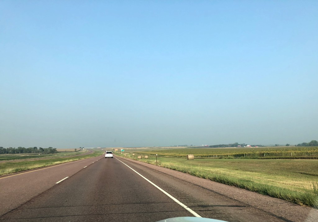 From Grand Forks we headed south. The air was dense with smog – wildfire smoke mixed with morning fog. About an hour into the drive the tire warning light came on. We stopped at a tire shop in a tiny town along the highway. The shop was open, and the radio was playing in the garage part. Andrea “hoo-hoo-ed” a couple of times with no results. Rather than wait for someone to return, we continued south to Fargo, where we got the tires pumped up and continued on our way.