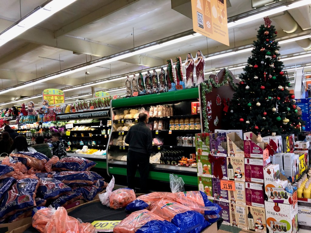 Stopped at another charger, we went into the nearby grocery store, crowded with families of shoppers. The store was amazing, with all sorts of wonders our local Fred Meyer doesn’t carry. Plastic bags of masa dough. Bins piled high with beans. Bags of tamale wraps and others full of dried chilis. Fresh avocados. In the meat section, pork lard ready to be scooped out – how much would you like? And over it all an assortment of piñatas. It all looked so exuberant. I was raised in the midwest, and compared to what I saw here my early family life just seems to have been so very bland.